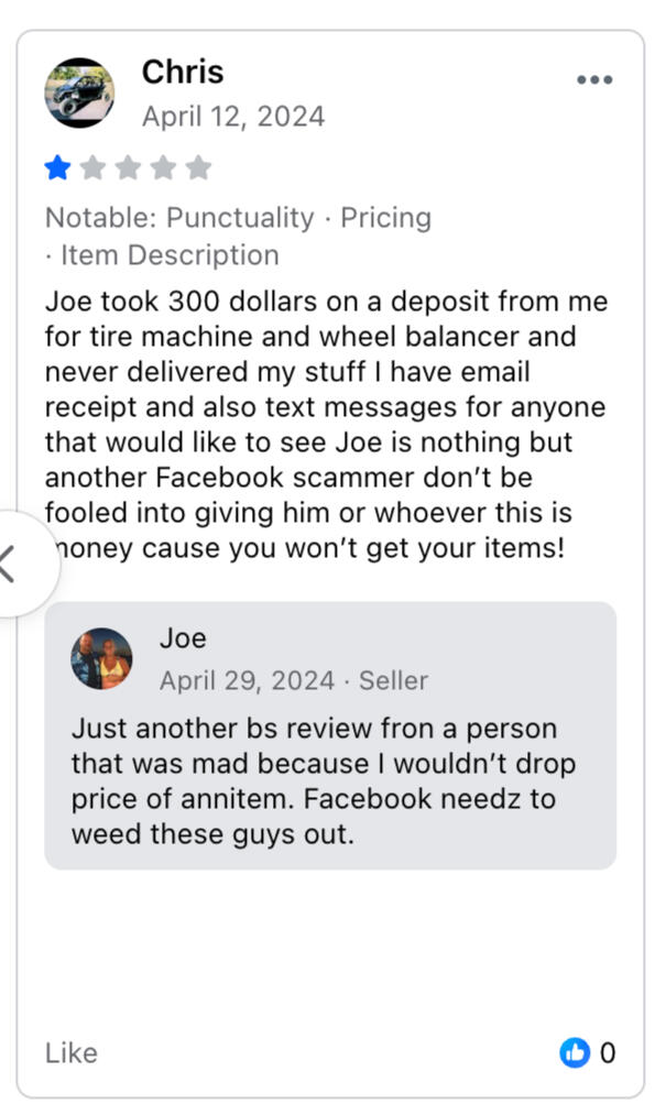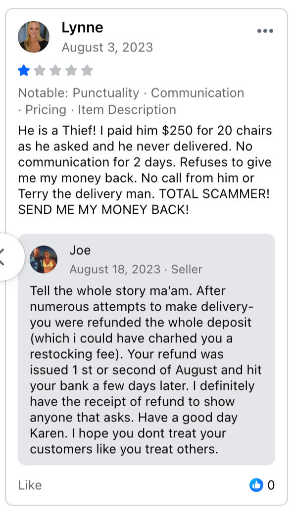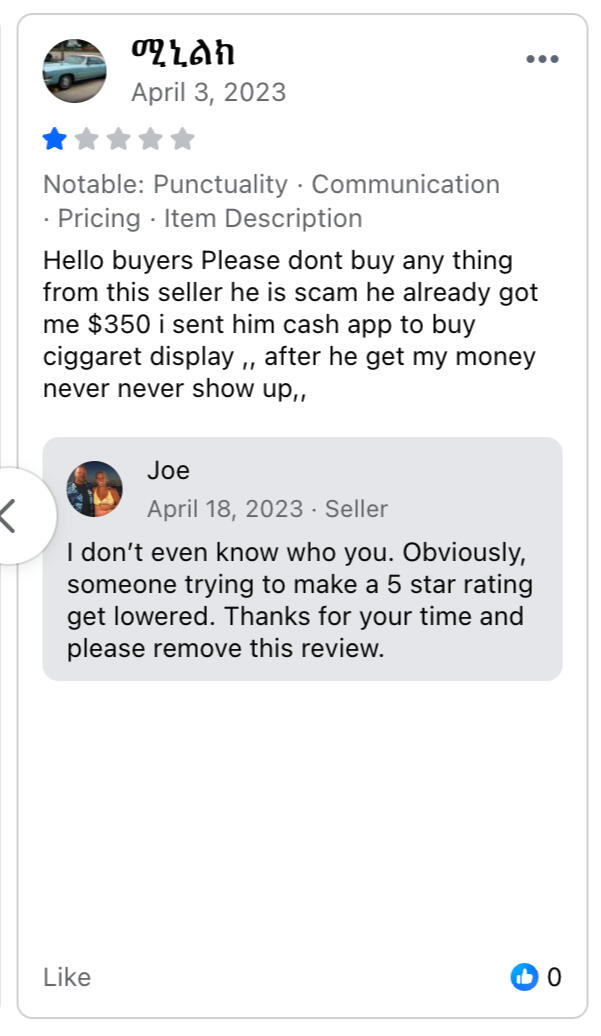 blocked me on Facebook before I could leave a negative